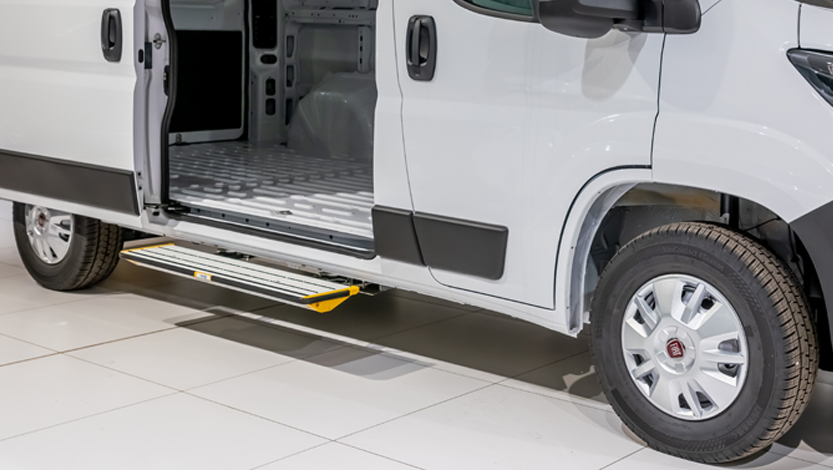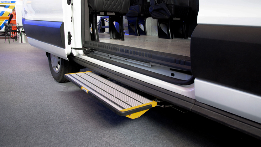 La serie di gradini rientranti GE-3-K è disponibile in varie larghezze (110 cm – 80 cm – 60 cm), con ridotto spessore (solo 6,7 cm). Azionamento automatico tramite apertura e chiusura della portiera; ideale per veicoli con pianale basso, ma che richiedono un aiuto per salita e discesa; raccomandato per percorsi con dossi e rampe. 300 kg di portata, sistema antiscivolo STEMGRIP, assoluta rigidezza sono fattori di sicurezza importanti.