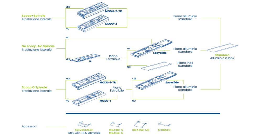 La serie di supporti barella Moduline si compone di moduli componibili con vano singolo o doppio, fissi o con traslazione laterale. Consente di combinare tra loro diverse tipologie di supporti barella, per ottenere una vasta gamma di soluzioni. Moduline può essere utilizzato sia in modo indipendente, che abbinato ad altri supporti come EDEN, MEC-EL, MEC, R-3L e Easyslide.